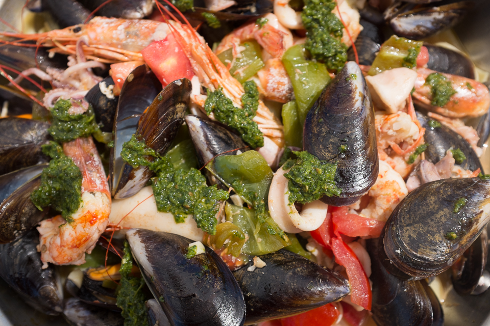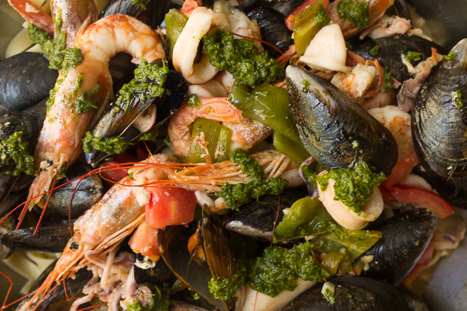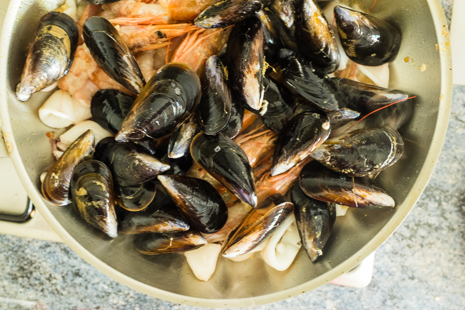 - Meanwhile, take a large heavy bottomed skillet which has a lid and heat the olive oil and butter. Add the crushed garlic and red chilli. Cook for a few minutes but don’t let it burn. Once it starts changing colour add a few tablespoons of water to cut the heat then throw in the seafood, lower the heat and cover. The seafood itself, especially the mussels, will release a lot of liquid – and flavour – for it all to cook in. After about 3 minutes, the mussels will open, the prawns will be pink and be firm to the touch and the squid will be cooked.
