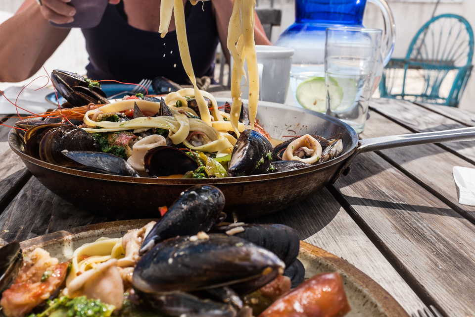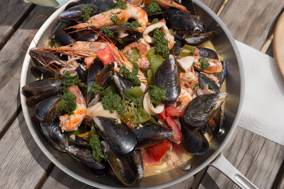 The final cooking stage and assembling of this dish takes less than 10 mins – 6 for the pasta and 3 or 4 for the seafood. If you clean your seafood, prepare the sauce in advance. The rest is a breeze. A sea breeze!