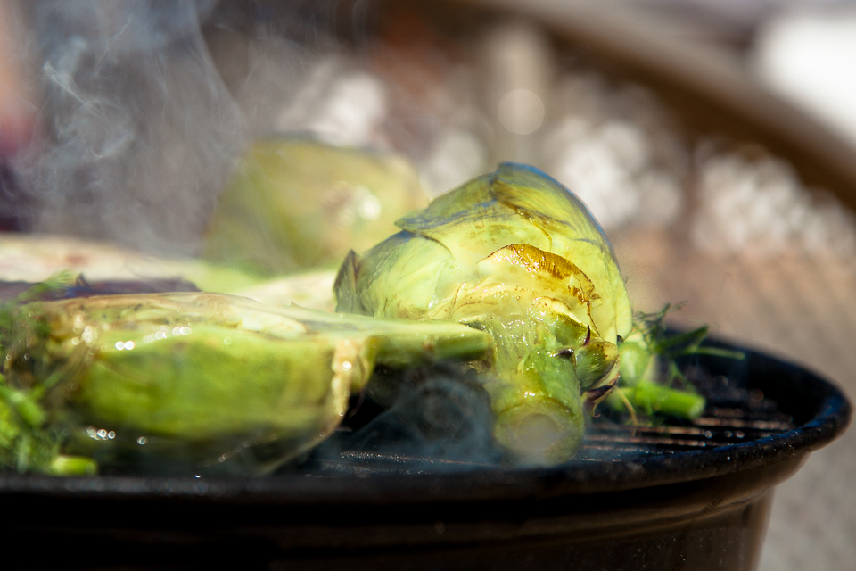 - I like to cook them on the plancha, a griddle, but a skillet would work fine as would a BBQ. If you are using the plancha or skillet, heat some olive oil and a sprinkling of coarse salt, then sear the marinated artichokes until they turn golden. If you are using a BBQ then just pop them right on.