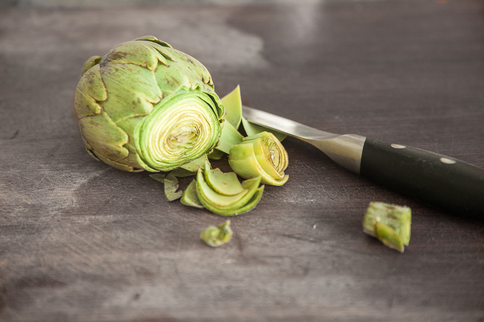 - Put a pot of salted water on to boil and cut off the pointy top of the artichoke and trim the stem.