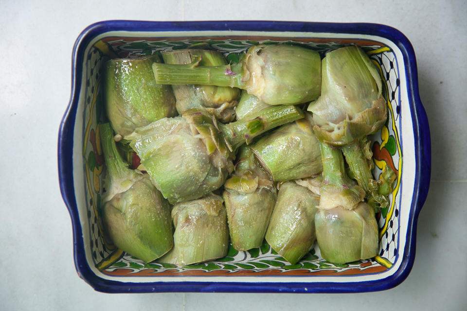 Perhaps we should only eat one at a time, slowly and patiently, but at this time of year, these baby artichokes are so cheap that you can’t really just buy one per person. Last week they were selling for as little as 50 cents a kilo, and for a kilo I got 8.