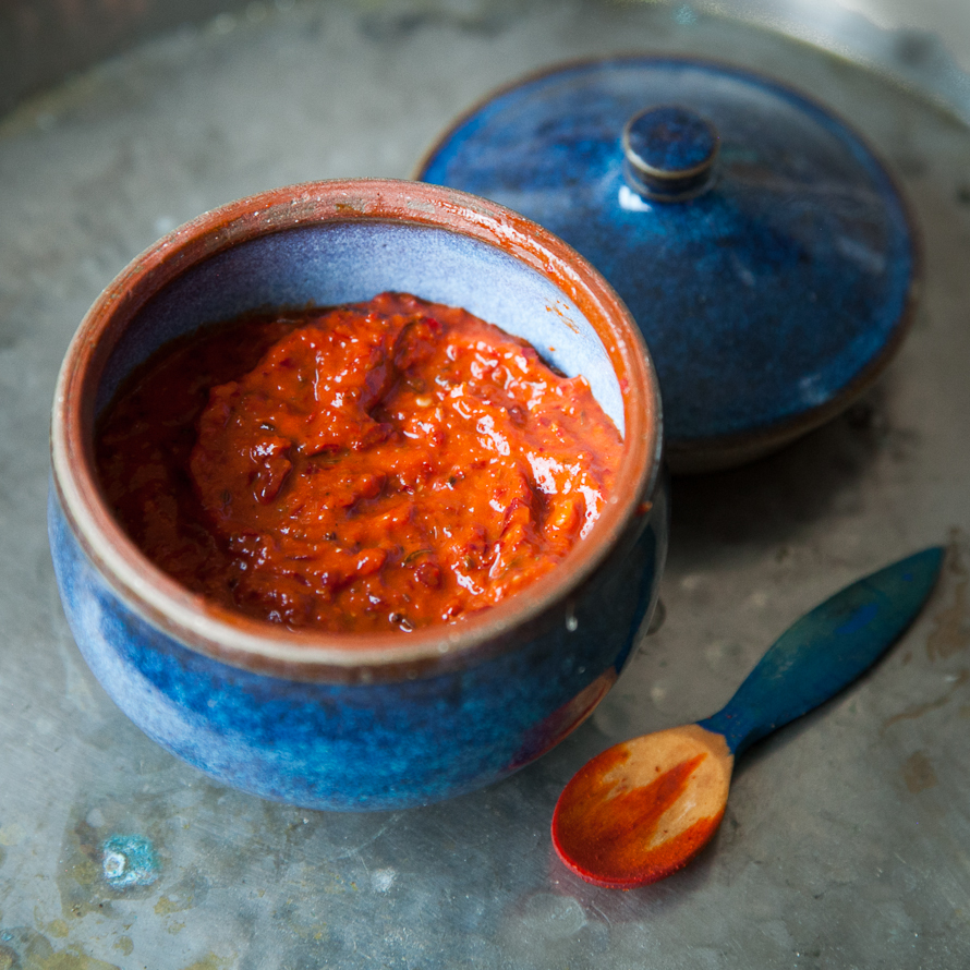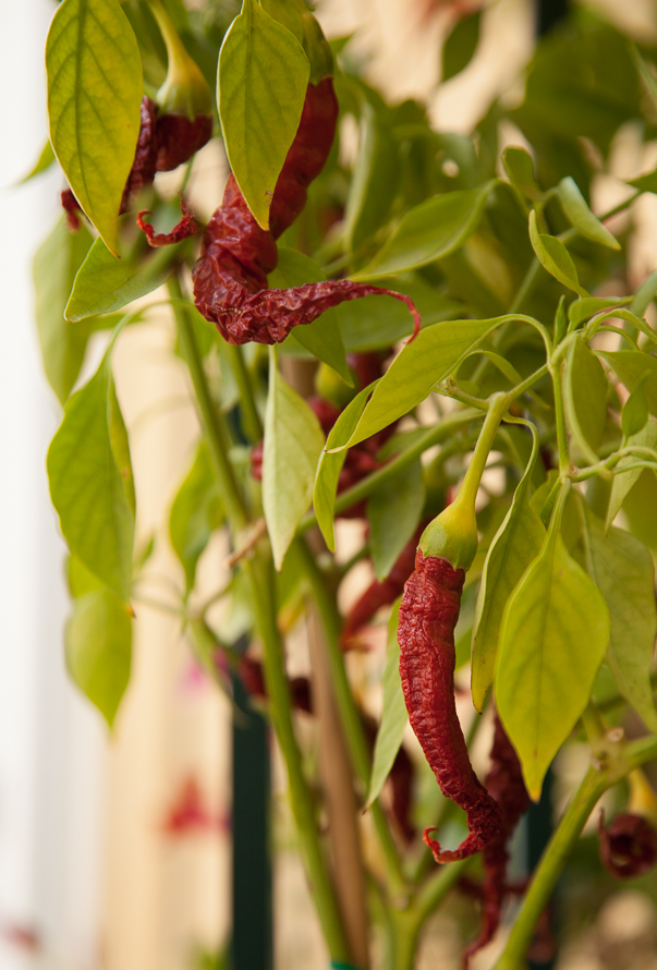 The chilies on my plants didn’t wait for me but dried themselves out alone. Yesterday I picked a large handful and turned them into harissa. Harissa originates from North Africa, in particular Tunisia and is basically a spicy chili paste with distinctly North African/Middle Eastern overtones. Until recently I always bought it ready prepared in a lovely colourful tube but I’ve discovered this homemade version which is so much better.