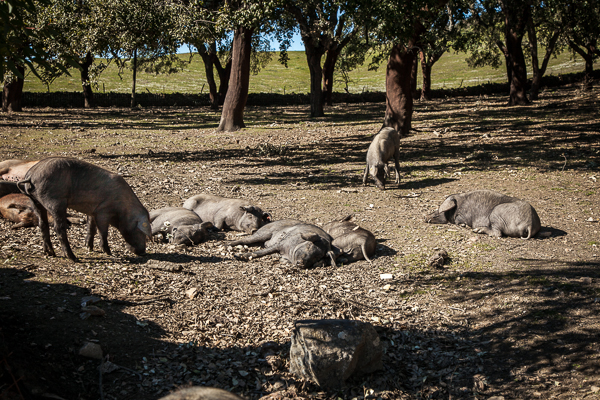 These oak forests, known in Spanish as ‘dehesas’, spread from Salamanca down along the Spain- Portugal border across to the province of Cordoba.The ham of the Iberian black pig, which grazes its way through life under the acorn trees, is known as bellota ham. Bellota means acorn. The fat that these pigs accumulate is the oil of the acorn which is very similar to olive oil – oleic acid – and is almost as healthy.