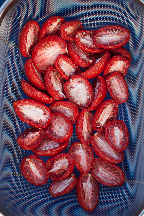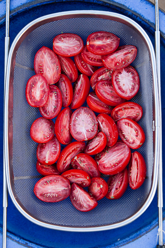 Sun dried tomatoes are not new. They’ve been around for ages..but they are expensive. However, is it so easy to make your own and actually it’s way better because you can control just how dry you want them. I really like what Sainsbury’s in the UK sell (sold?) called SunBlush tomatoes. It’s the same principle only that the tomatoes are not dried out completely but keep a bit of soft chewiness and are deliciously and intensely sweet.