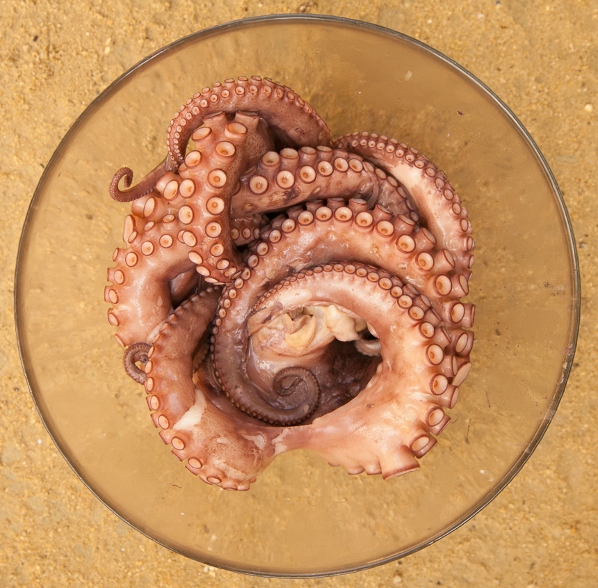 This strange looking creature has always fascinated me. I can’t decide if it looks pre historic or futuristic. It’s a mysterious creature. Underwater it is really quite beautiful, with its long flowing arms trailing elegantly behind as it shoots itself forward, and its ability to wrap itself around rocks and completely camouflage itself. But out of the water, well, it doesn’t look very attractive. There are plenty of people who couldnt be paid enough to put a piece of octopus in their mouth but they probably aren’t people who live around the Mediterranean. Around here, ugly as it is, this is a delicacy and I for one love it.