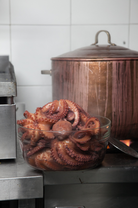 Whether it’s another octopus myth or not, David swears by cooking it in a copper pot and dipping it three times in the boiling salted water before dropping it in. The copper pot certainly looks good .