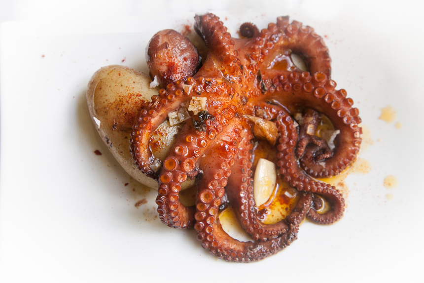 But here in Spain, the classic way to serve pulpo is a la gallega, which is simply cooked octopus pieces served on a bed of sliced boiled potato, with a healthy sprinkling of pimenton (a mixture of hot and ‘sweet’), a few good glugs of olive oil, and some coarse salt. Delicious!