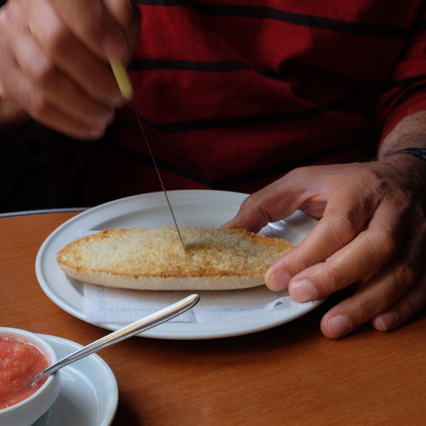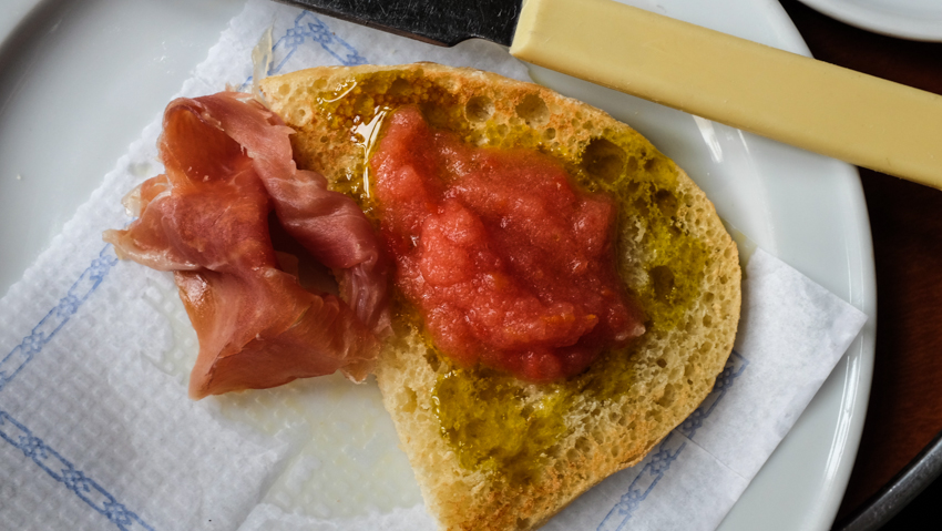 Olive oil for breakfast. Yes, thats right. Not cornflakes or porridge or bacon and eggs. The Spanish, especially the further south you go, start their day with a good dose of liquid gold. Like so much of life in Spain, breakfast is often quite a social event, taken in a bar mid morning, catching up on news and gossip. The typical Andalusian breakfast is a toasted mollete with olive oil, crushed tomato and – optional – a slice of jamon. A mollete, a local bread, is round and flat and a bit like a bready pita. The idea is to first poke some little holes in it and then pour over the olive oil. This way more oil gets nicely absorbed and doesn’t all run straight off.