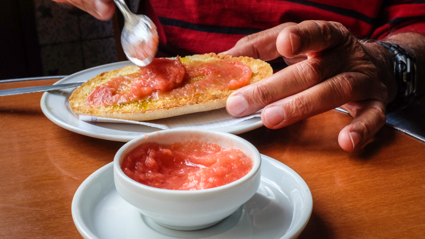 Yo normalmente preparo este desayuno a mortero, primero pelo tomates frescos, los corto y los llevo al mortero, entonces les pongo un pellizco de sal marina, medio diente de ajo muy picado, y sigo moliendo a mano, entonces añado una cucharada del aceite de oliva, y lo emulsiono hasta que se integre. Y se sirve.” Ideal para los vegetarianos”,