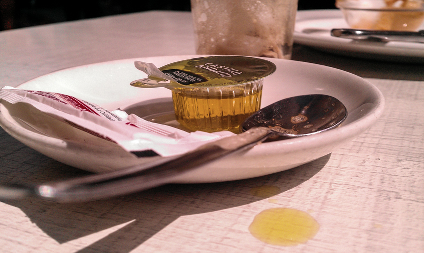 Until a couple of weeks ago the olive oil was served in a traditional glass jug but Spain has just passed a law which prohibits the use of refillable containers. This ban was originally an EU proposal which, due to public outcry, got reversed last May. However, Spain, Italy and Portugal all decided to go ahead and implement it. So now, in place of the original cruets, bar owners are offering olive oil in little plastic containers like the ones you get for butter. The argument is that it will protect the consumer from poor quality or tainted oil and from unscrupulous bar owners who mess with our food. (isn’t that what food inspectors are for?) I find these little plastic pots very sad. They are so blatantly industrial. In my opinion, this is just one more law which in the name of ‘health and safety’, is killing tradition and culture. It is beyond me how, at at time when we are so aware of the need to reduce waste, that Spain should enforce an idea like this. Not only are these three countries going to start rattling in plastic containers, they are also going to be throwing away vast quantities of ‘virgin’ olive oil since hardly anyone uses the full amount.