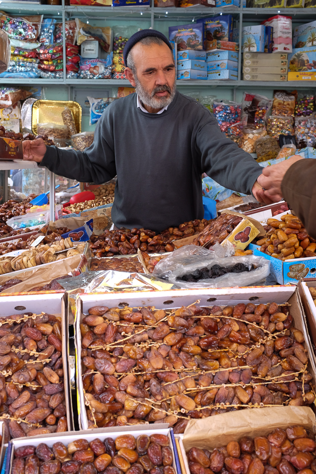 And everywhere you turn there is food – mountains of fresh herbs, fruit and vegetables, sides of sheep hanging from hooks, chickens, rabbits, camel heads, baskets piled high with dates and figs, spices and olives.