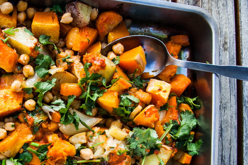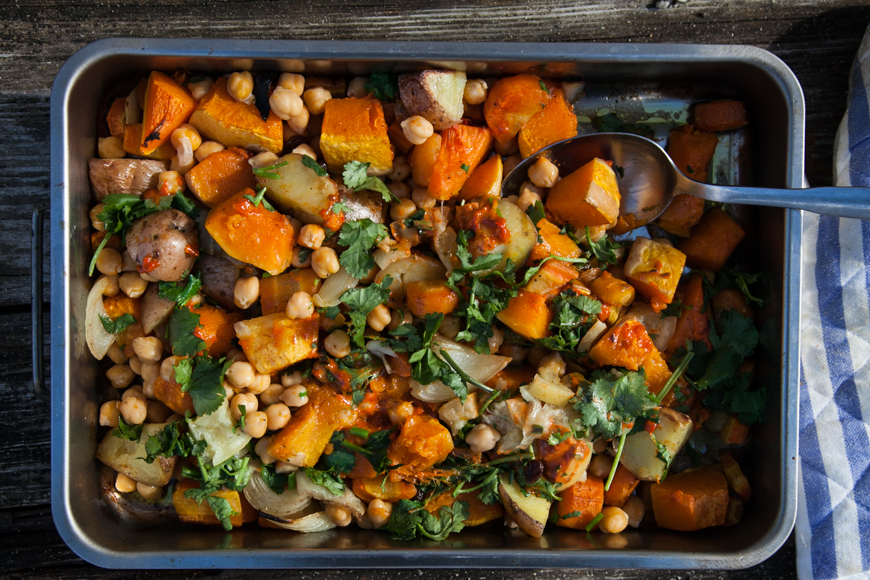 Oven Roasted Winter Vegetables with Chickpeas and Harissa