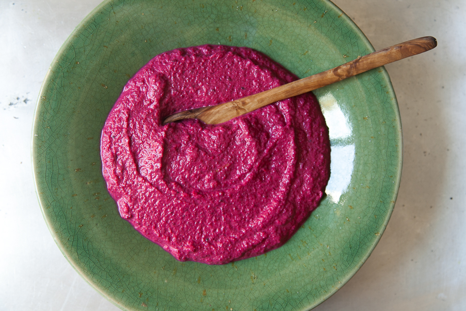 Os presento algo verdaderamente rico que podéis hacer con tahini, la pasta a base de semillas de sésamo de mi post anterior. El sabor es fantástico y su aspecto alucinante! Algunos lo llaman hummus de remolacha pero no estoy segura de que ese sea el nombre adecuado. El hummus se hace con garbanzos y aunque es verdad que puedes añadir remolacha al hummus, esta receta está hecha sólo con tahini y remolacha. Así pues, lo llamaremos tahini de remolacha.