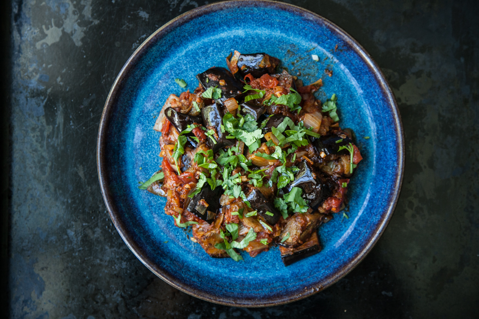 Aubergine – a.k.a eggplant – has changed in recent years. You used to have to let it sit sprinkled with salt to get rid of all the bitter juice before you could do anything with it. Far from bitter, the varieties we get now are so mild that you are lucky if they taste of anything at all.